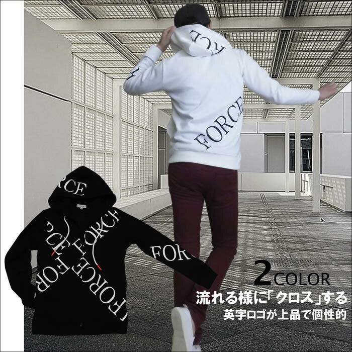 【送料無料】【ポイント10倍】フルジップパーカー 英字 ロゴ カットソー フード ZIPパーカー クロス 長袖パーカー ユニセックス ジェンダーレス 白 黒【あす楽対応】【あす楽_土曜営業】【あす楽_日曜営業】